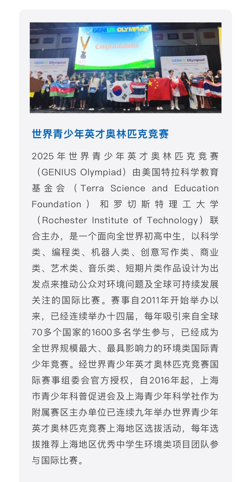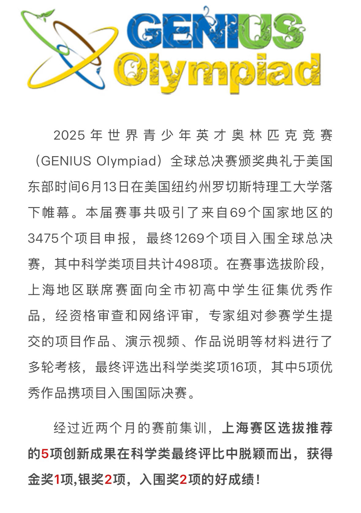 【捷报】2025年世界青少年英才奥林匹克竞赛 (GENIUS Olympiad)上海代表队喜获佳绩